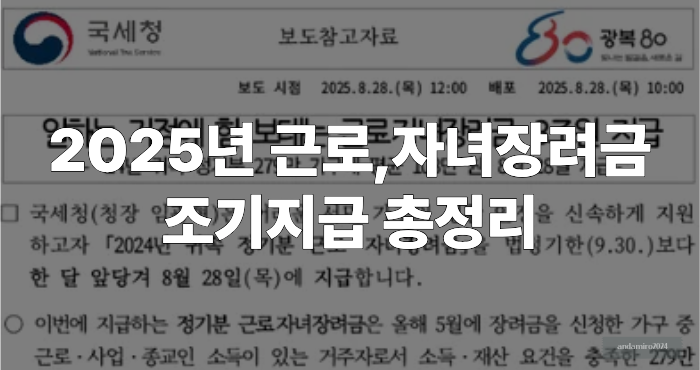 안녕하세요, 2025년 근로·자녀장려금이 드디어 8월에 조기지급되었다는 소식, 다들 들으셨죠? 기다리던 장려금을 조금 더 빨리 받을 수 있게 되어 정말 기쁜 소식이 아닐 수 없는데요. 하지만 '내가 받을 수 있는 건가?', '얼마나 받을까?' 등 궁금한 점이 많으실 거예요. 오늘 이 글 하나로 지급일, 대상, 금액, 확인 방법, 신청 기준, 주의사항까지 모든 것을 한눈에 정리해 드릴 테니, 놓치지 말고 꼭 확인해 보세요.